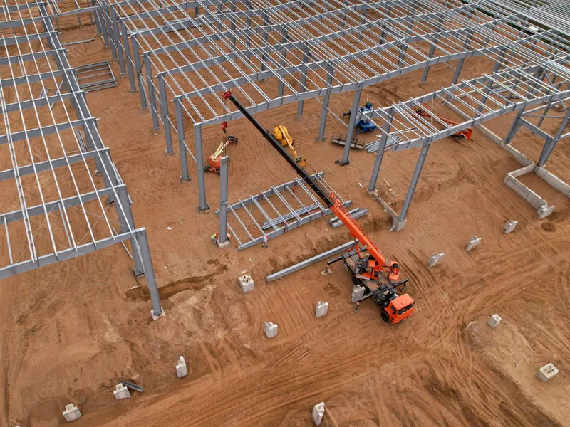 ପ୍ରିଫ କଟିଏଟେଡ୍ ଉପାଦାନ ନିର୍ମାଣ ସାଇଟରେ ପହଞ୍ଚି କ୍ରେନ୍ ଏବଂ ଅନ୍ୟାନ୍ୟ ଭାରୀ ଯନ୍ତ୍ରପାତି ବ୍ୟବହାର କରି ଏକତ୍ରିତ ହୁଏ | ସ୍ଥାପନ ପ୍ରକ୍ରିୟା ସାଧାରଣତ the ମୂଳଦୁଆ to ଟି ସ୍ତମ୍ଭ ନିର୍ମାଣ ଏବଂ ଲଙ୍ଗଙ୍ଗ ସହିତ ଆରମ୍ଭ ହୋଇଥାଏ | ପରେ ସ୍ତମ୍ଭଗୁଡ଼ିକୁ ସଂଯୋଗ କରିବାକୁ ବିମ୍ ଗୁଡିକ ତାପରେ ସ୍ତମ୍ଭକୁ ସୂଚାଇଥାଏ, ଗୋଦାମର ଫ୍ରେମ୍ ଗଠନ | ଛାତର ଟ୍ରସ୍ ଗୁଡିକୁ ସମର୍ଥନ କରି ଫ୍ରେମ୍ ପାଇଁ ସଂରକ୍ଷିତ ଏବଂ ସୁରକ୍ଷିତ | ଏହି ବ୍ୟବସ୍ଥିତ ଆଭିମୁଖ୍ୟ ଏକ ଦୃ urdy ଏବଂ ସ୍ଥିର ସଂରଚନାକୁ ସୁନିଶ୍ଚିତ କରେ |